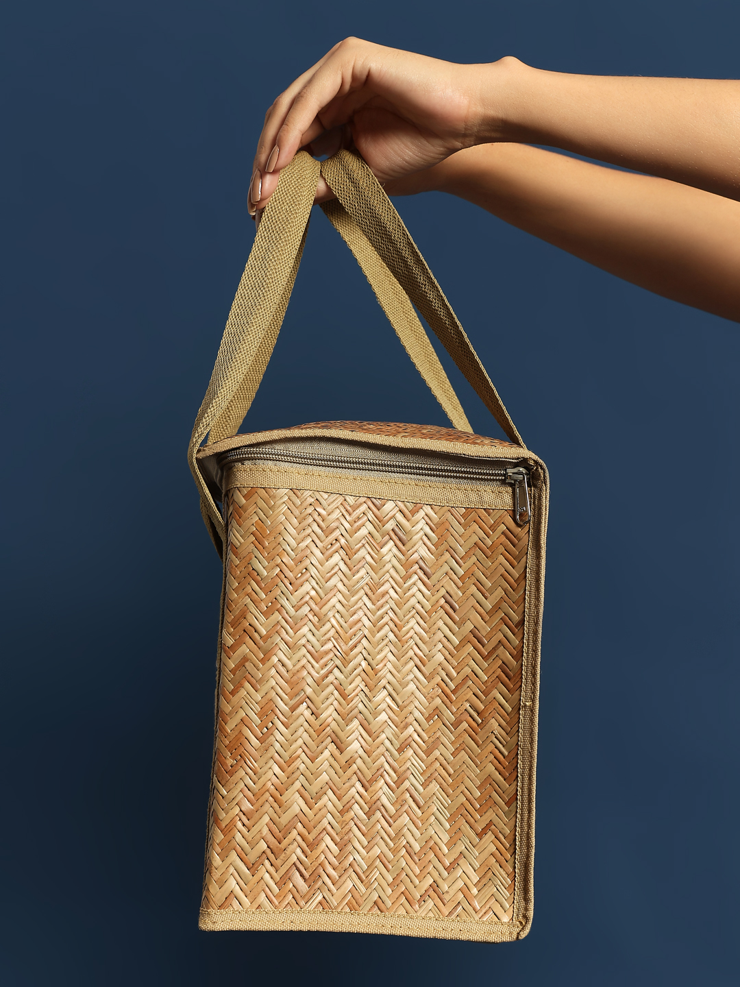 The compact yet spacious design makes it perfect for office, travel, or picnics, while the sturdy handles and smooth zipper ensure long-lasting use. The beautiful woven pattern adds a touch of artisanal charm to your everyday routine.
