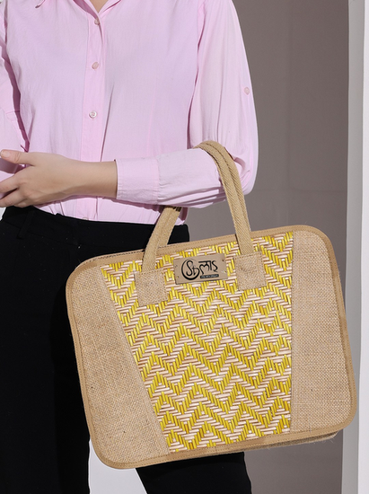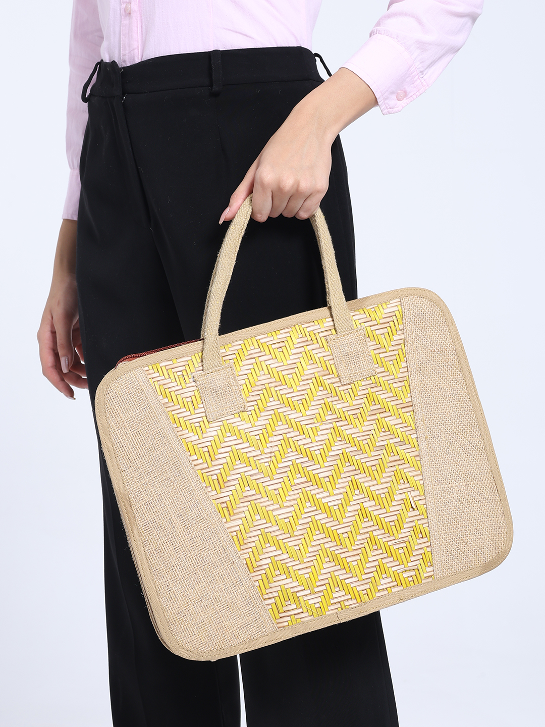 Brighten your workday with this Handcrafted Jute & Cane Laptop Bag from Sthulas, featuring a vibrant yellow woven cane pattern and natural jute texture. Designed for modern professionals who value sustainability and style, this eco-friendly office tote is both functional and fashionable.