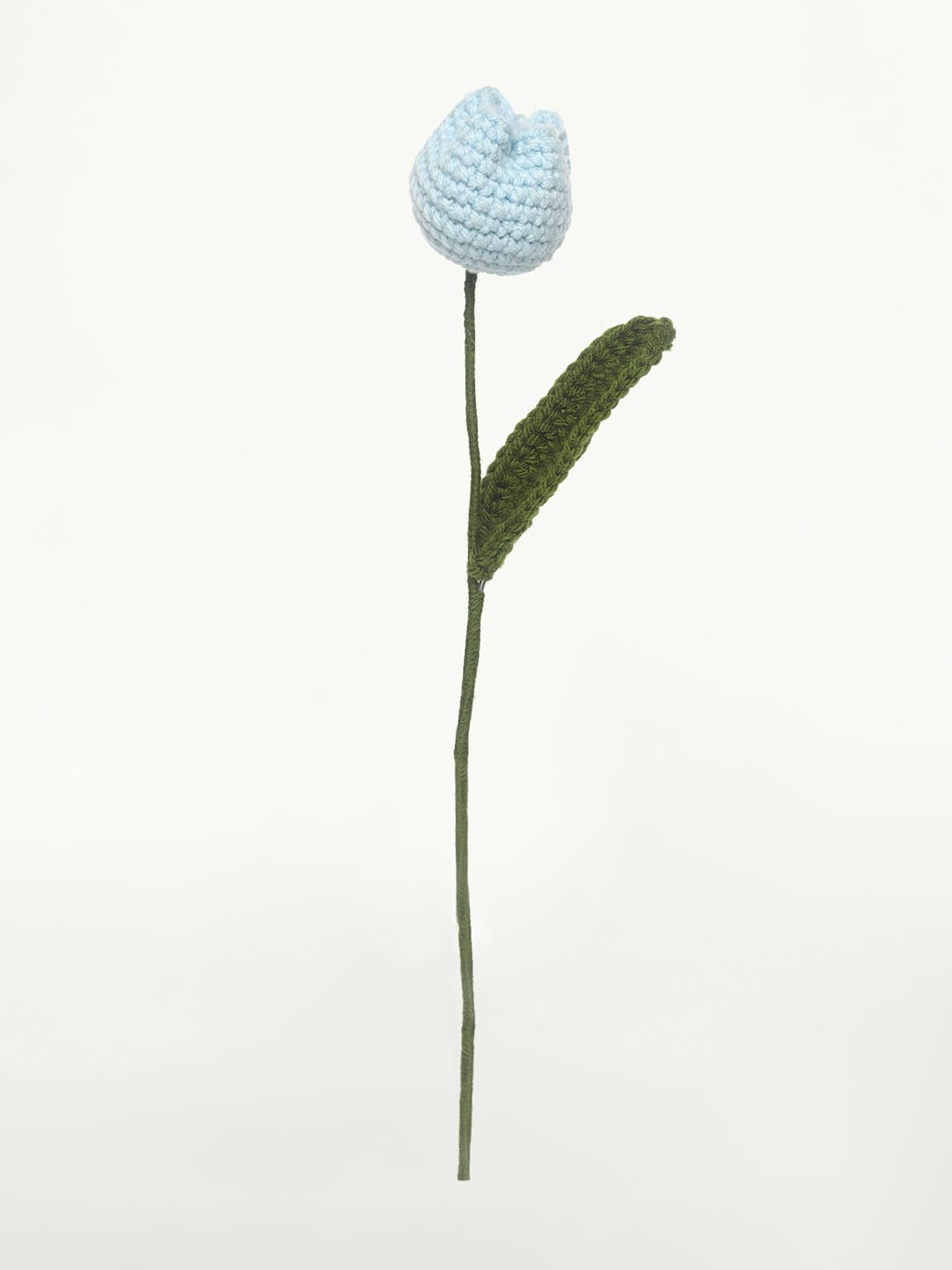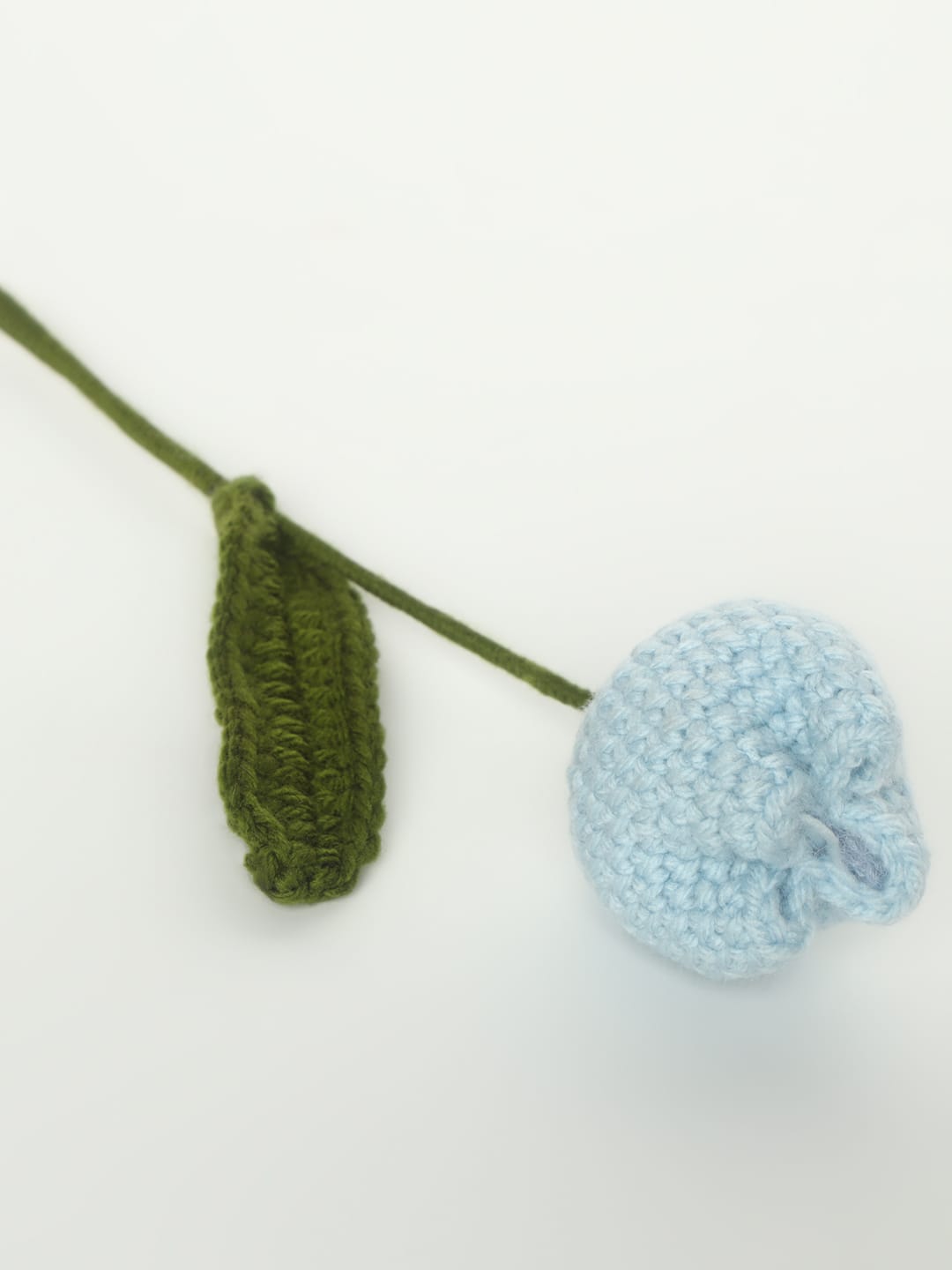 Add a soft and elegant charm to your space with this beautifully handmade crochet blue flower. Crafted with care, this artificial knitted flower features a pastel blue bloom, detailed green leaf, and a long flexible stem for easy styling.