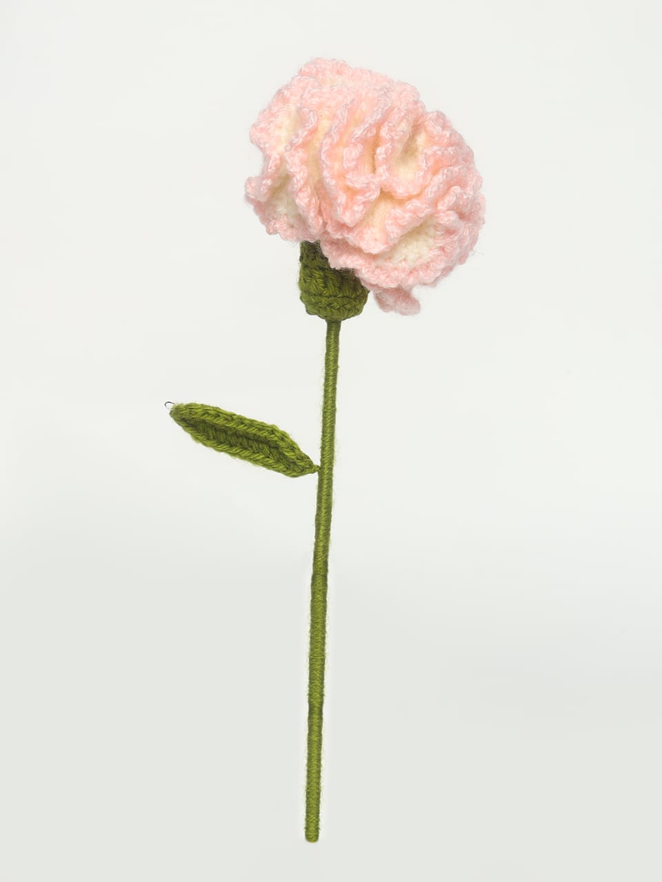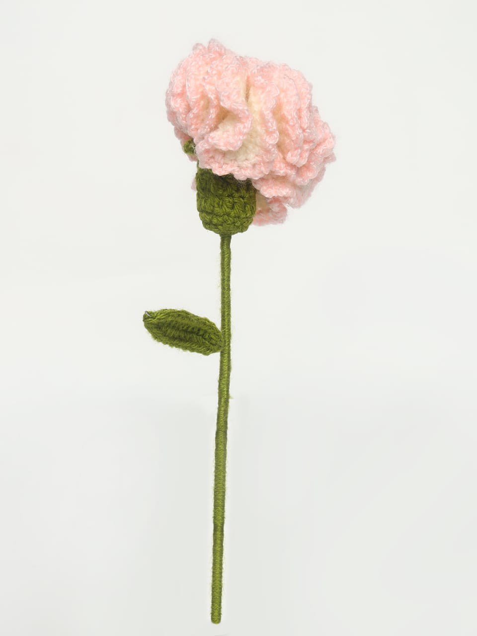 Bring softness and elegance to your space with this beautifully handmade crochet pink carnation flower. Designed with layered textured petals in a delicate pink shade and finished with a green stem and leaf, this artificial knitted flower adds a graceful and charming touch to any decor.