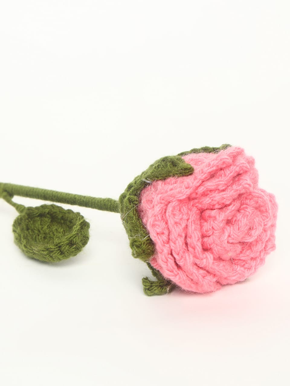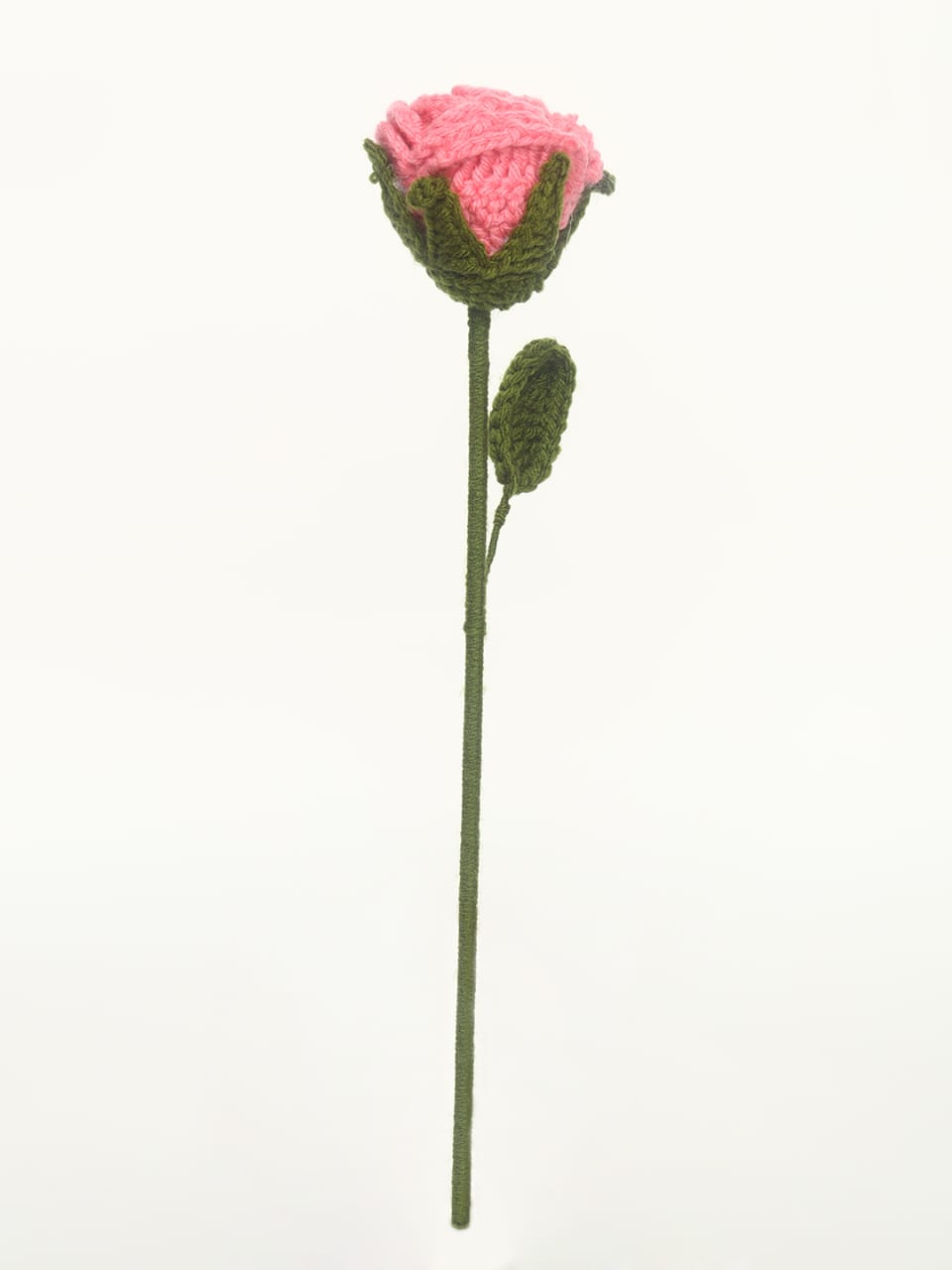 Add a romantic and elegant touch to your space with this beautifully handmade crochet pink rose. Designed with detailed layered petals and a green stem with leaves, this artificial knitted flower brings timeless charm to any setting.