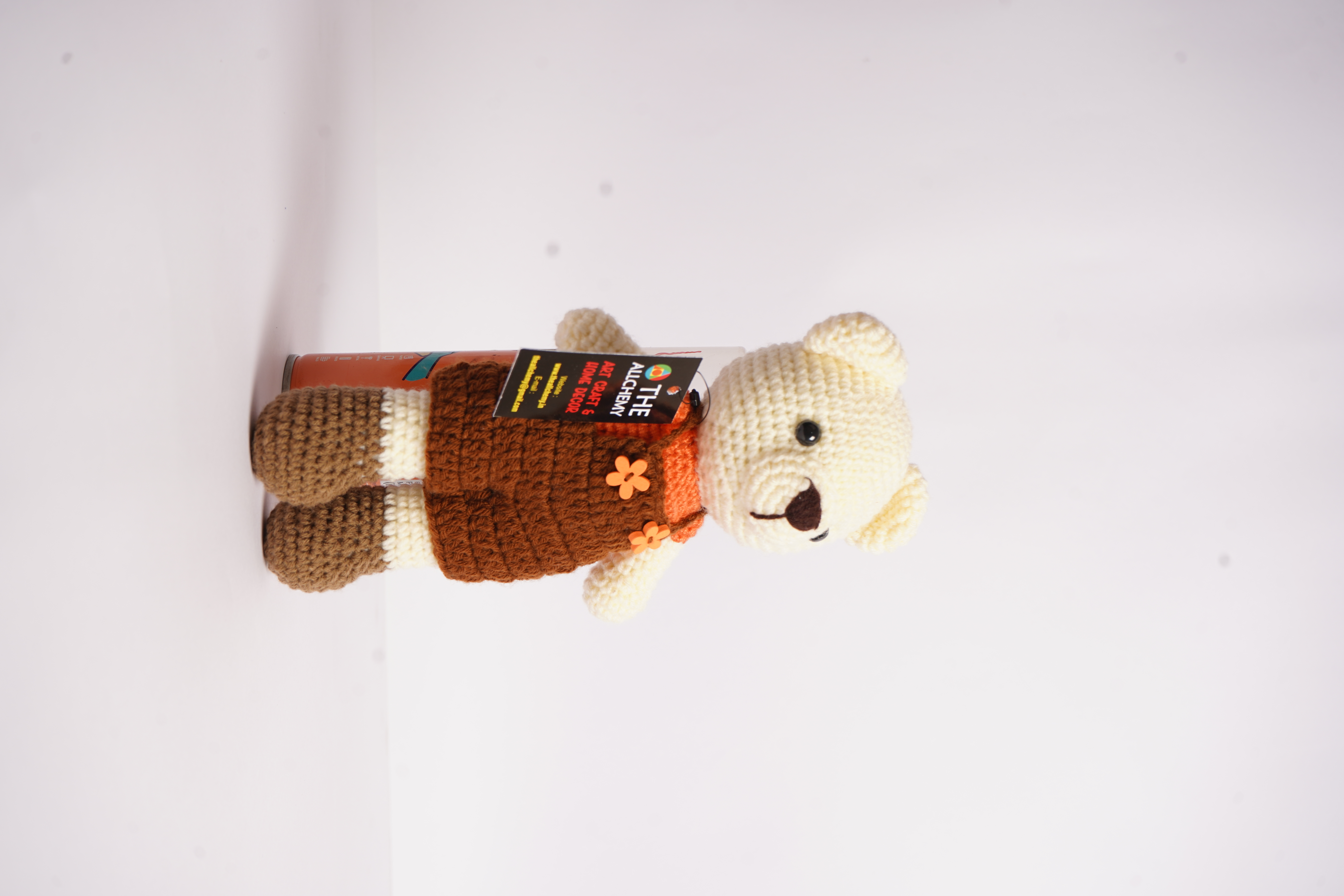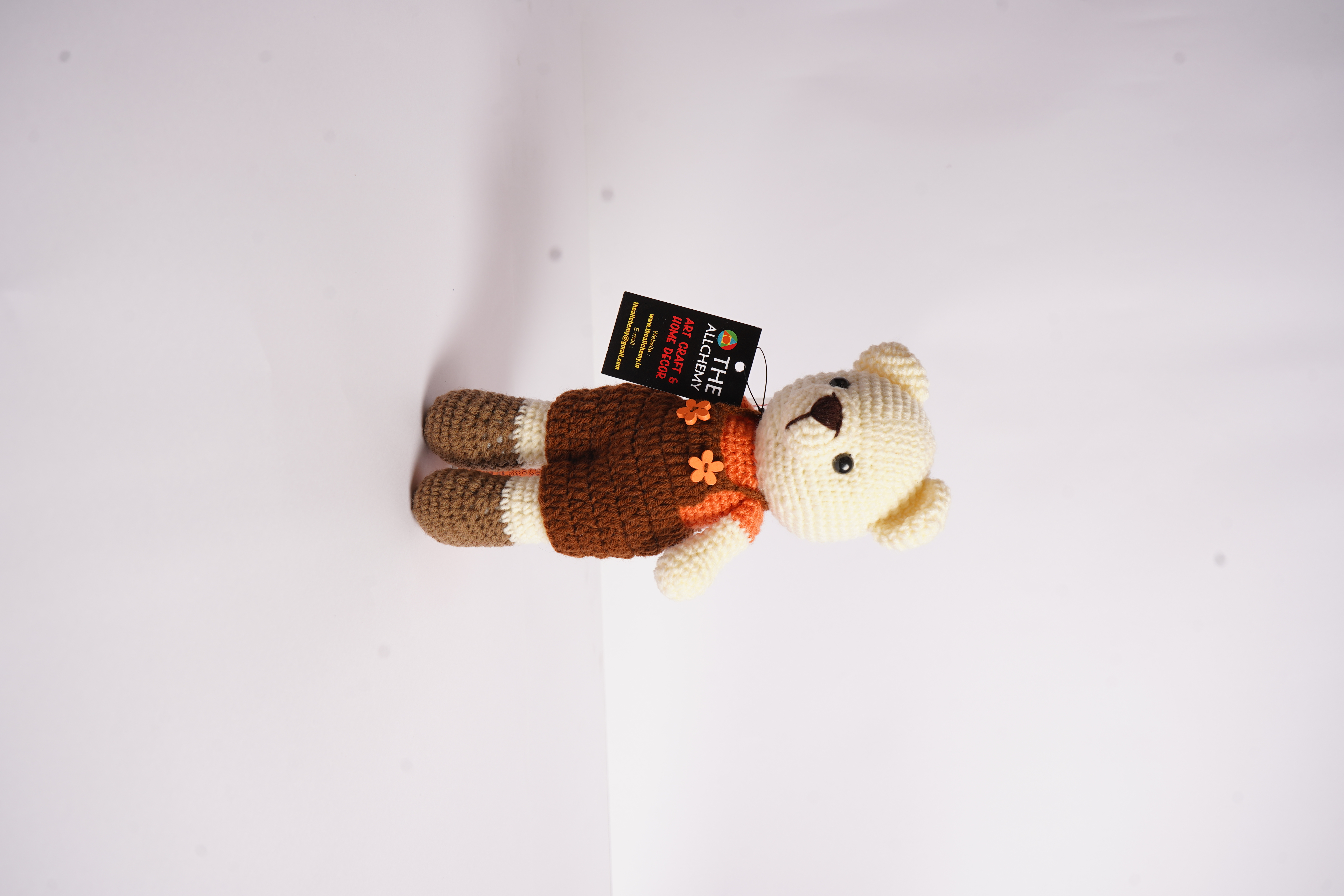 This adorable Handmade Crochet Teddy Bear is crafted with love and premium-quality yarn, making it the perfect companion for babies, toddlers, and kids. The teddy features a cute cream-colored body, soft yarn texture, and a stylish brown dungaree with little floral details—completely safe, washable, and baby-friendly.