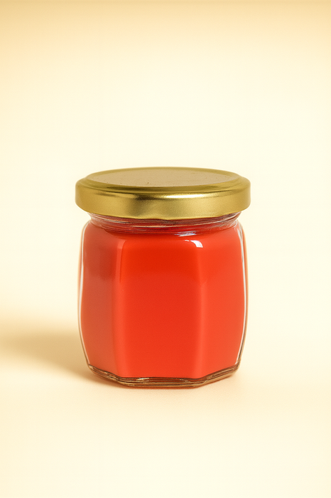 Presented in an elegant red glass jar with a golden lid, it’s designed to bring warmth and sophistication to any setting. Perfect for romantic evenings, festive décor, or gifting, this eco-friendly candle adds a touch of charm and serenity to your home.