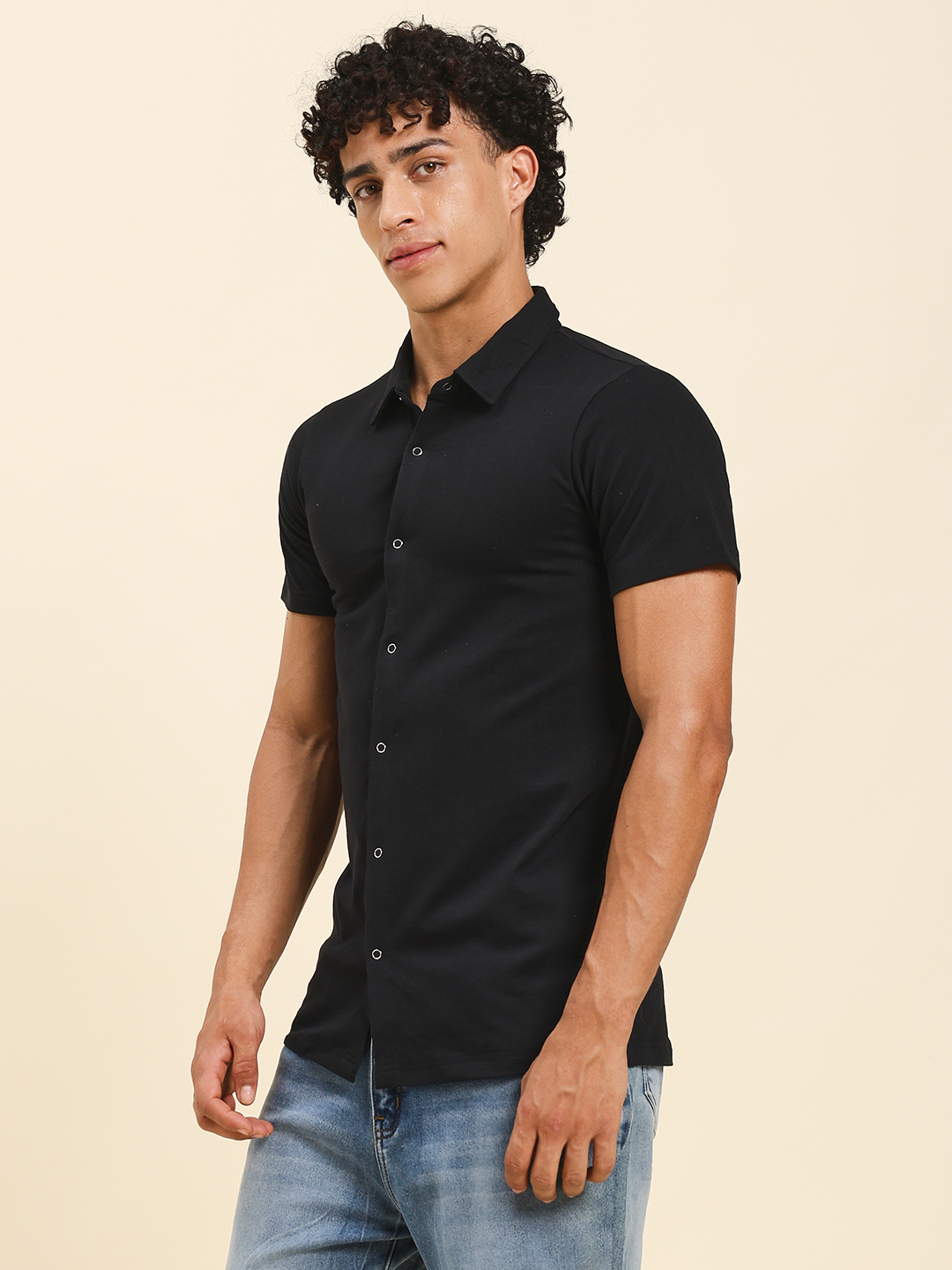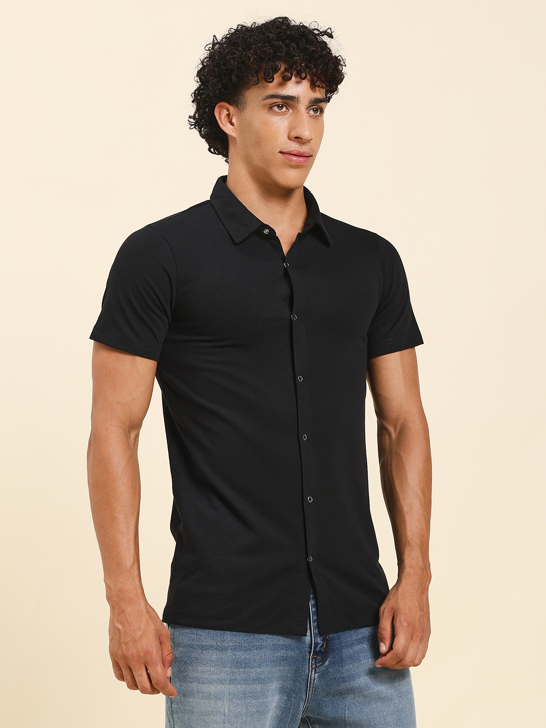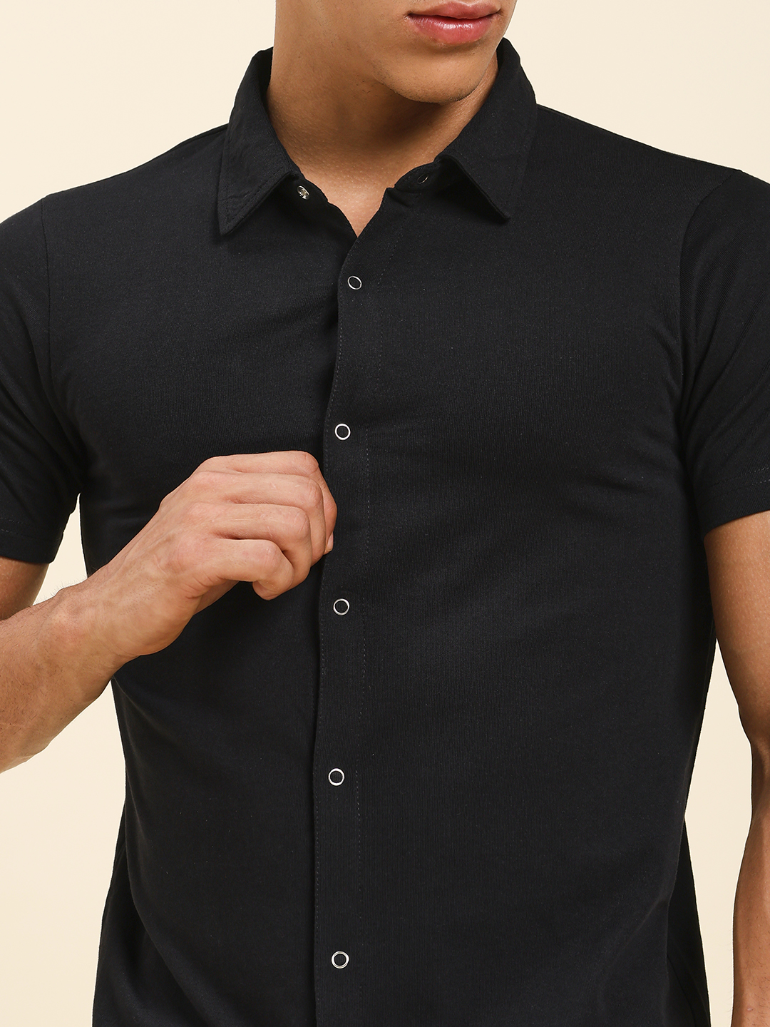 Upgrade your everyday style with this Men’s Black Button-Down Cotton T-Shirt from Sthulas. Designed with a sharp collared neckline and front button closure, this tee brings the perfect balance of comfort and smart casual appeal.