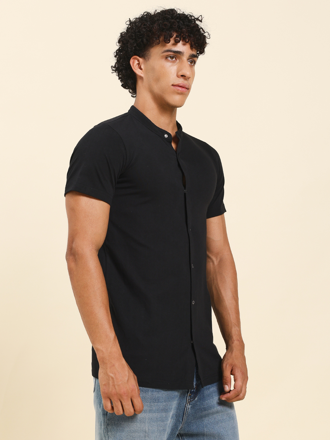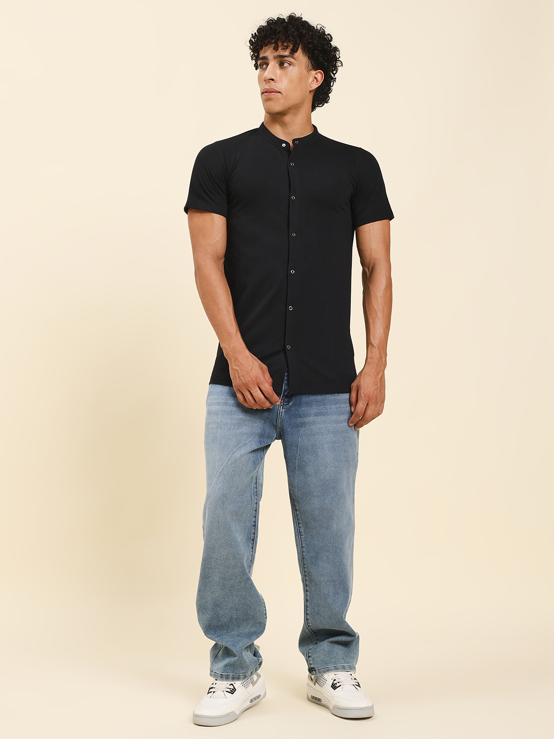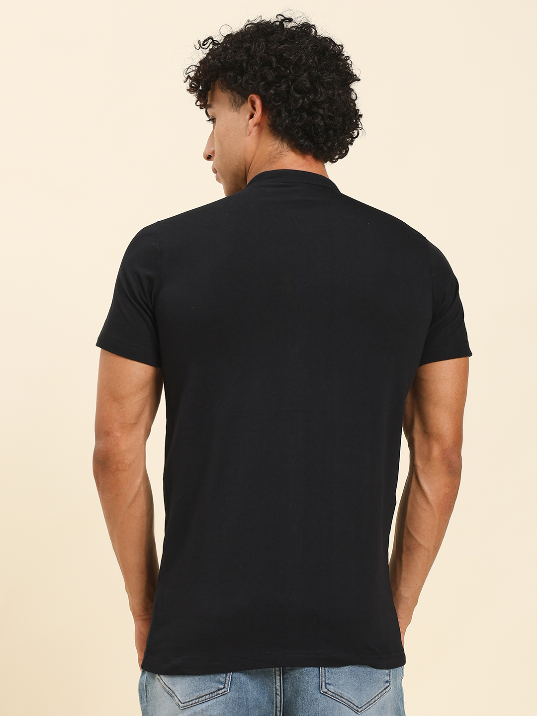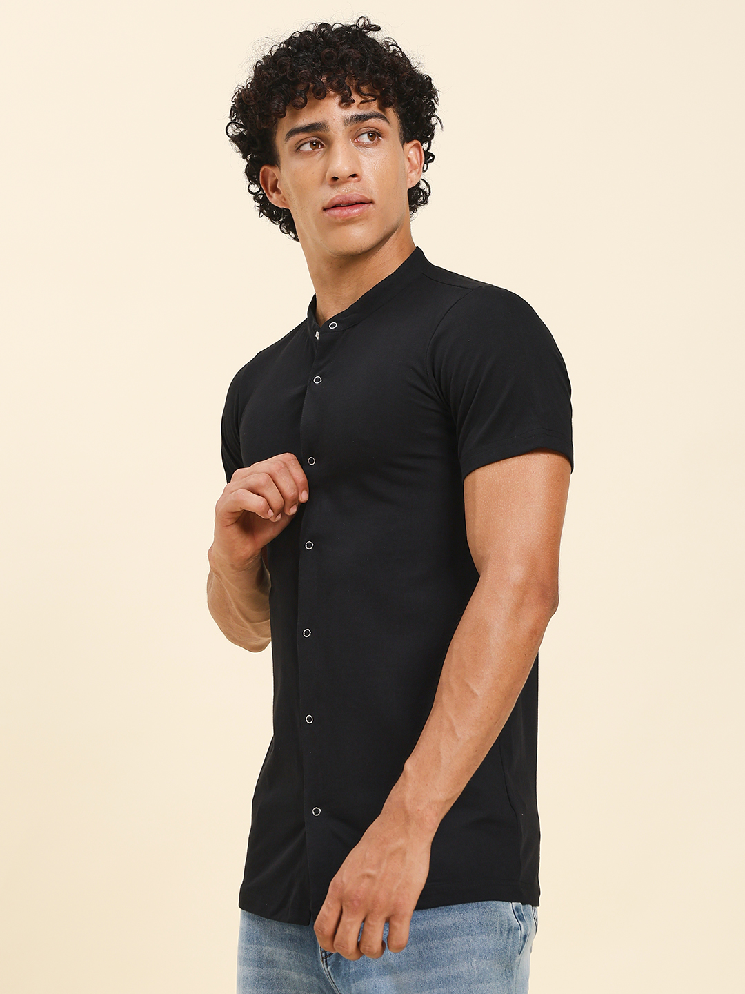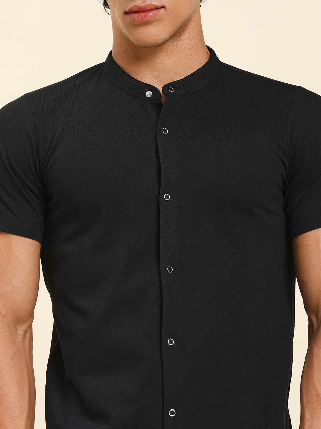 Upgrade your wardrobe with this Men’s Black Mandarin Collar Button-Down T-Shirt from Sthulas, designed for men who love clean, modern, and effortless style.