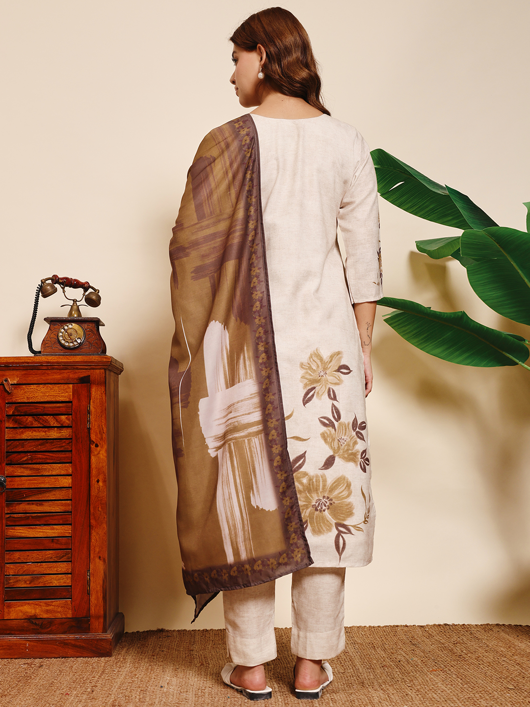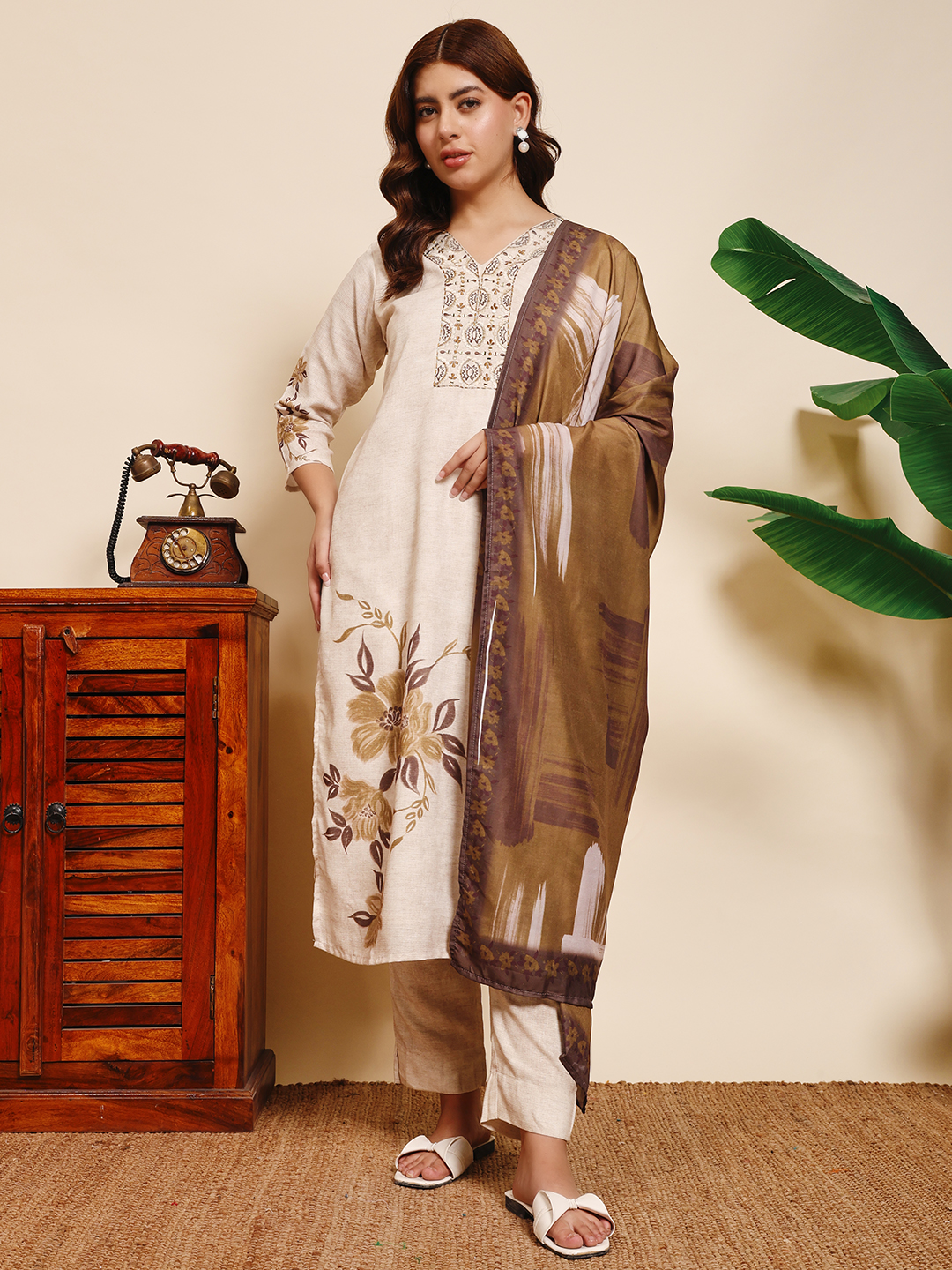 The earthy beige tones are beautifully balanced with a brown printed dupatta, making it an ideal outfit for festive gatherings, office wear, or casual outings. This kurta set perfectly blends minimalist aesthetics with timeless ethnic appeal, ensuring you look effortlessly graceful on every occasion.