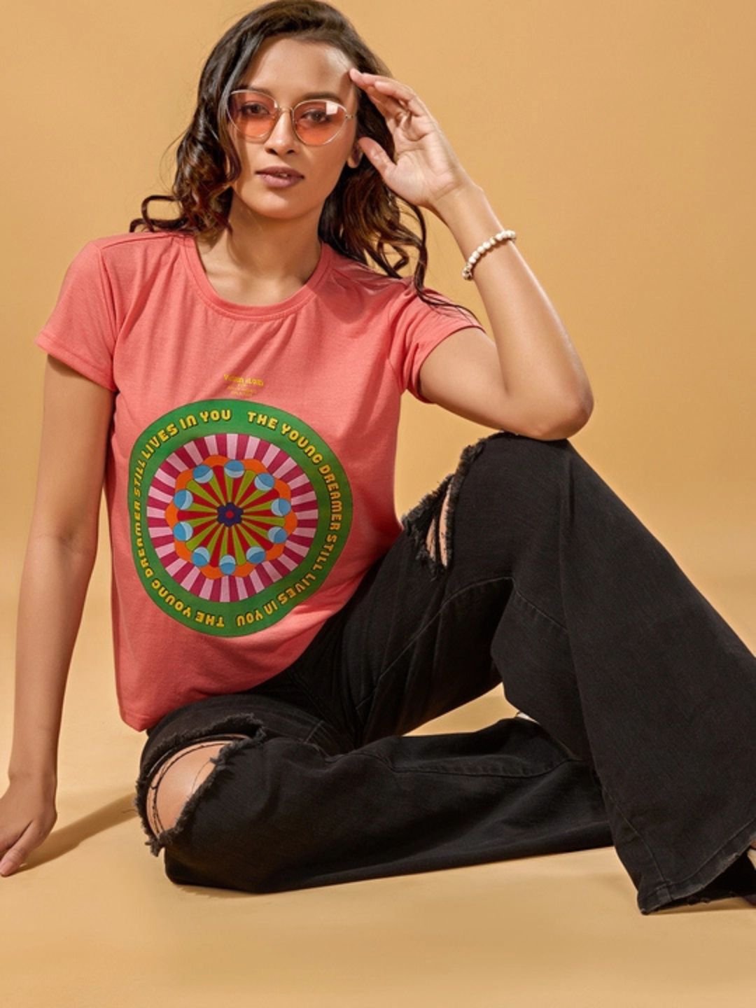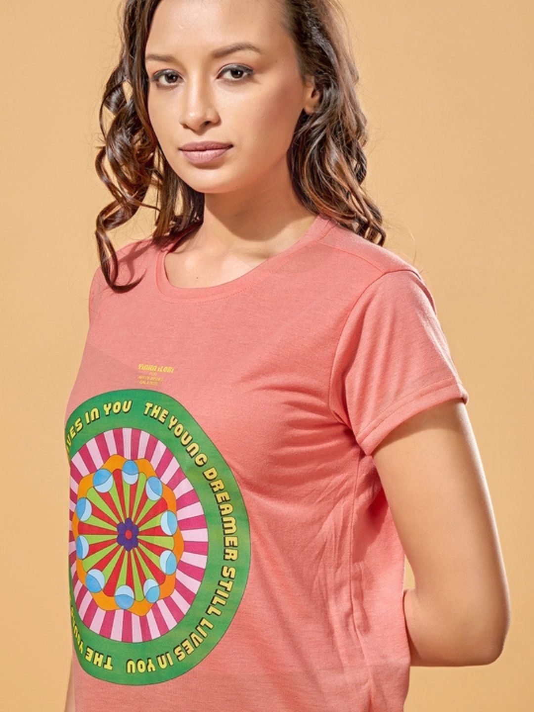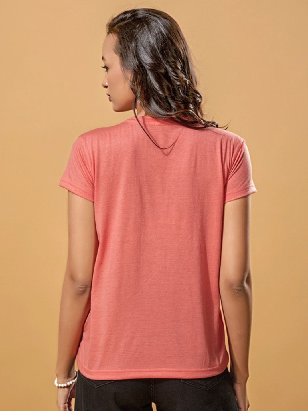 The t-shirt features a flattering peach color that complements a wide range of skin tones. This soft, warm hue is versatile enough to be paired with various bottoms, from jeans to skirts, making it a great addition to your everyday wear. The half sleeves provide a balanced look, offering just the right amount of coverage while keeping you cool.