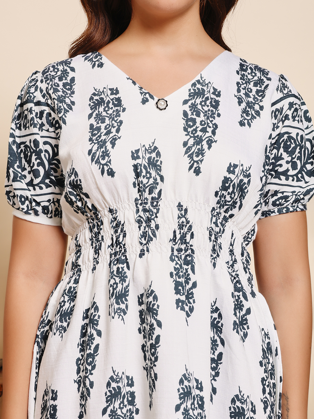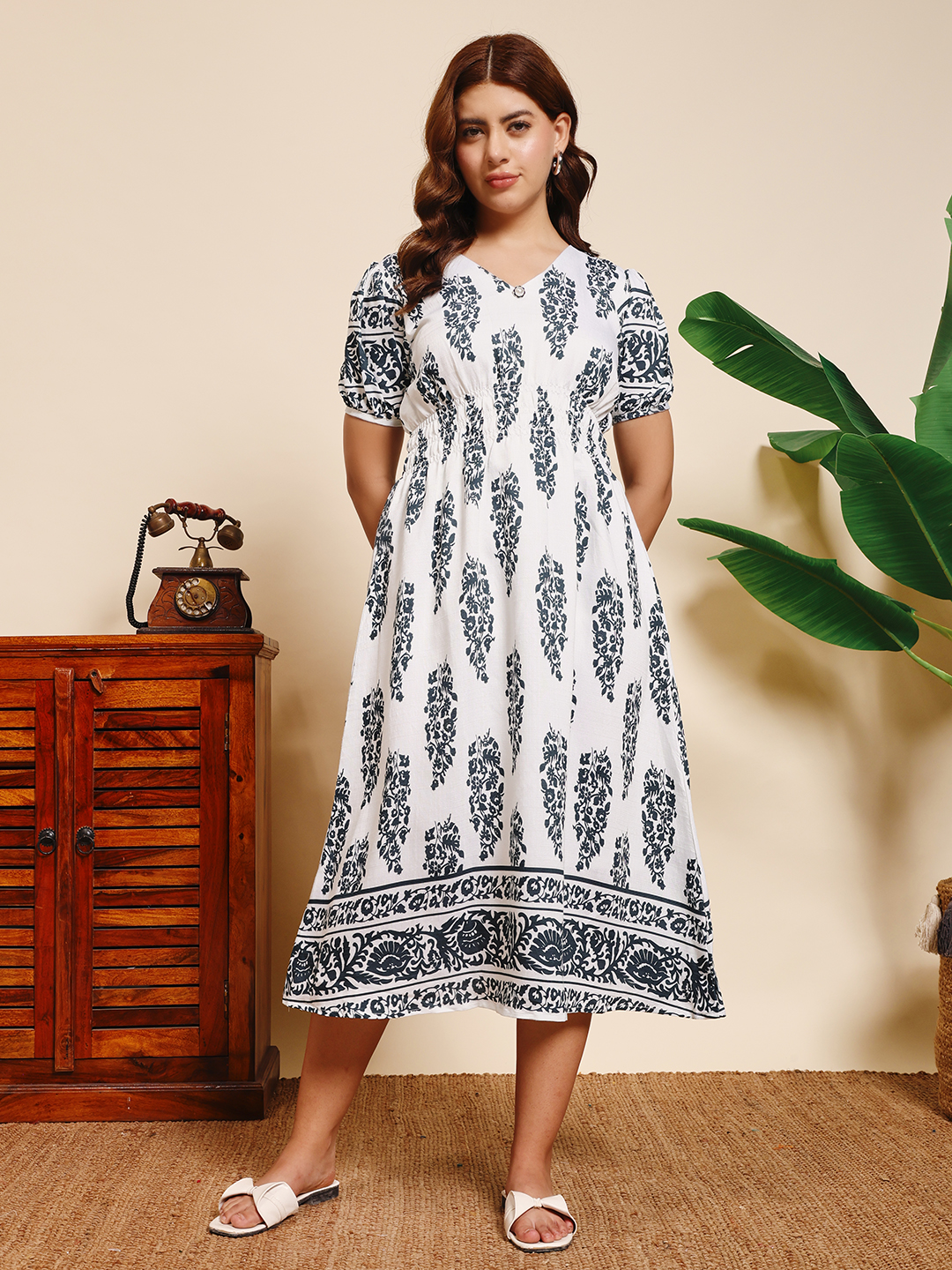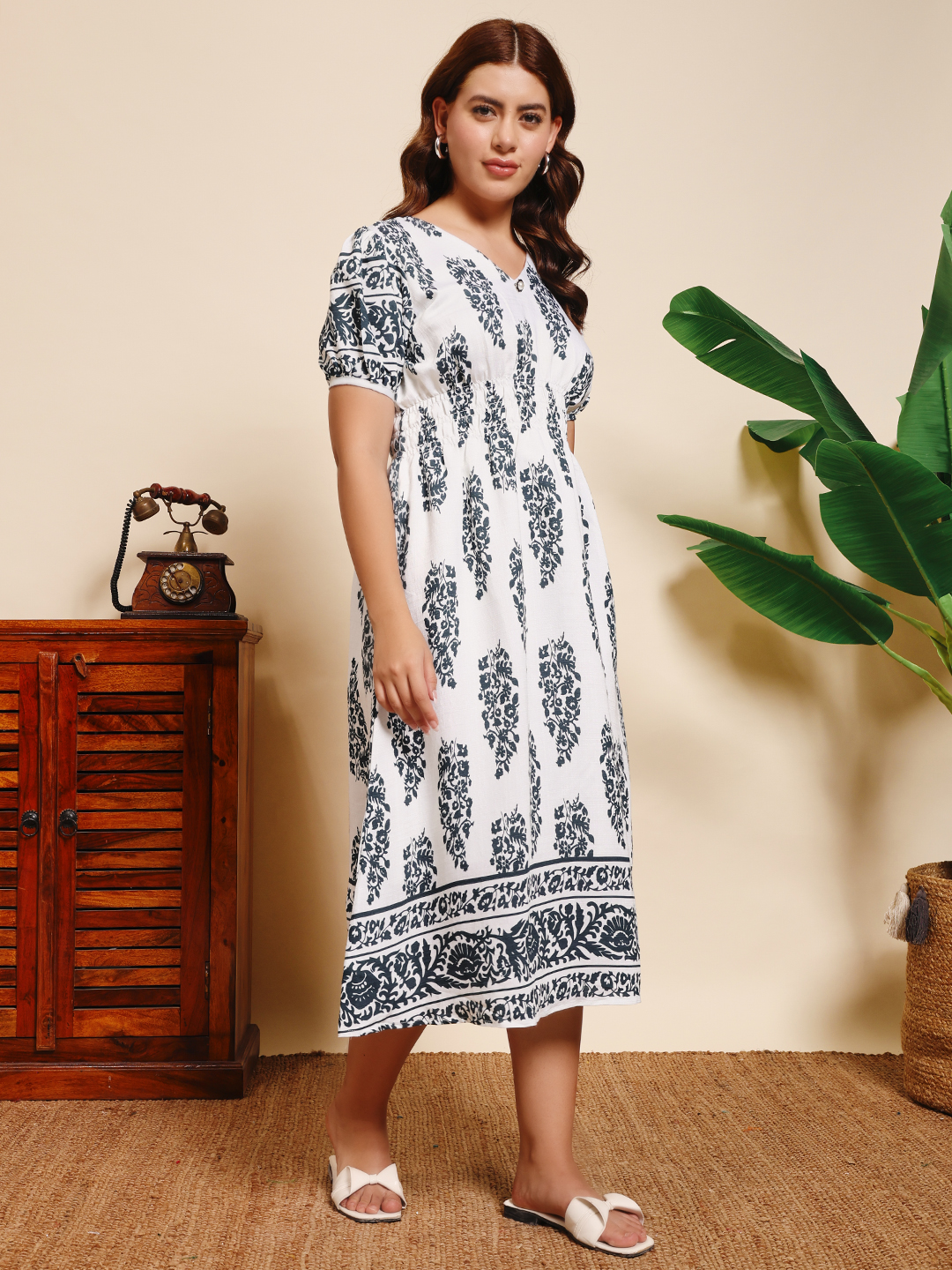 Step into effortless elegance with this White & Navy Blue Block Print Midi Dress from Sthulas. Designed with soft breathable cotton, it features a flattering fit-and-flare silhouette, delicate puff sleeves, and a charming hand-block floral motif all over.