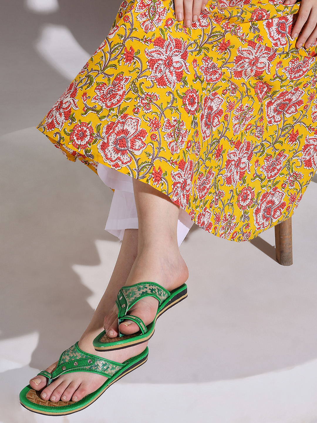 Bring home the blend of comfort and style with these Sthulas Green Woven Ethnic Slippers, designed for the modern woman with traditional taste.