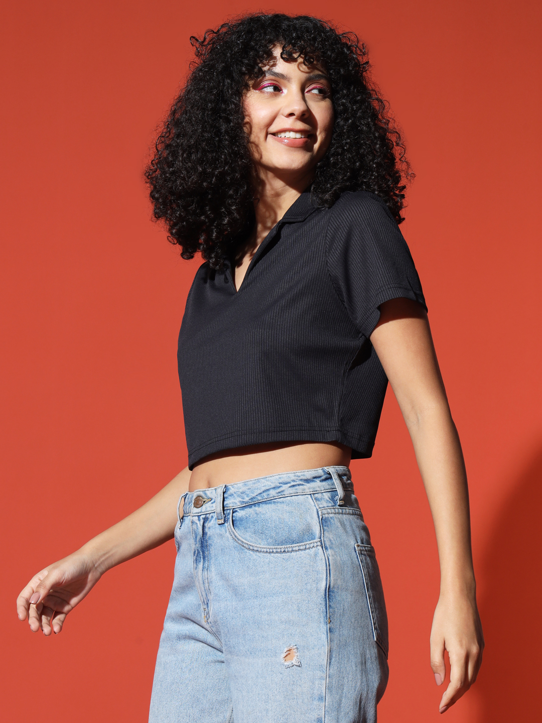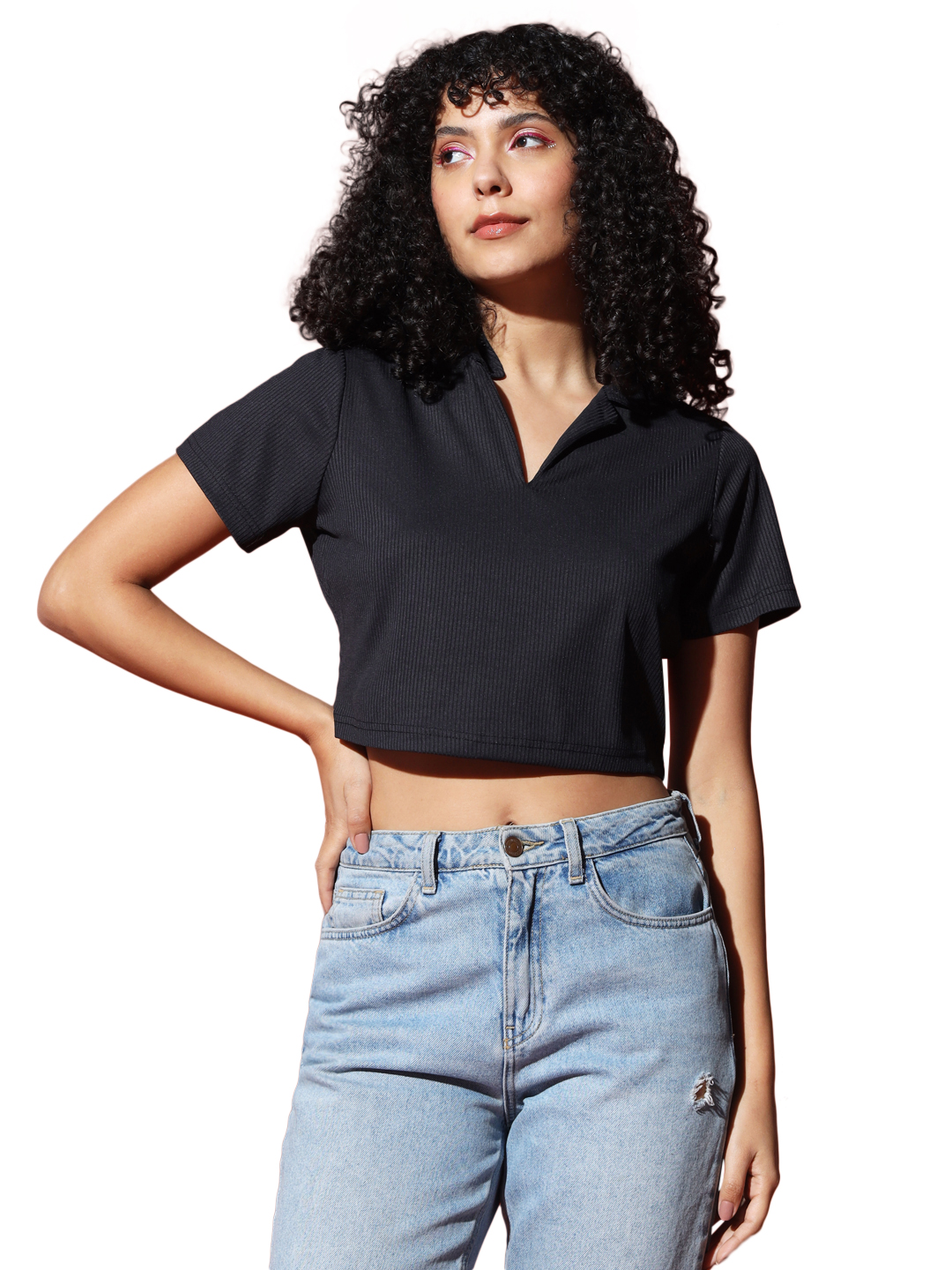 Upgrade your everyday style with this Black Notch Collar Crop Top from Sthulas, crafted with a soft ribbed stretch fabric for ultimate comfort and a sleek, flattering fit. The notch collar neckline gives a chic polo-inspired look while keeping it minimal and modern.