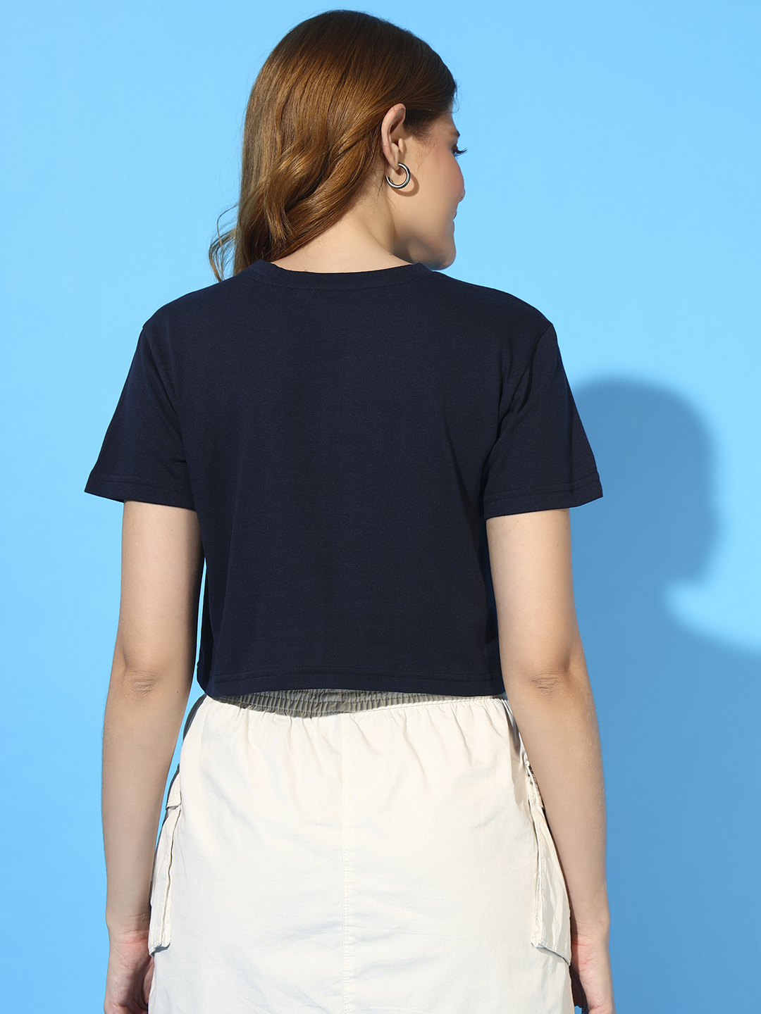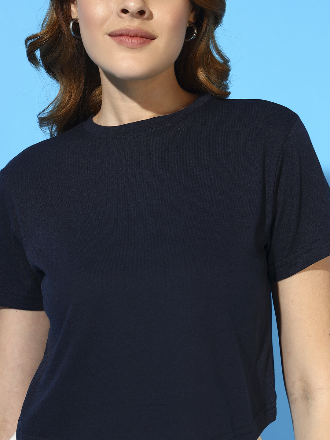 The clean round neckline, short sleeves, and trendy slightly curved crop hem give it a chic and modern look. Pair it effortlessly with joggers, denim, cargos, skirts, or shorts for a stylish casual vibe—ideal for outings, travel, college, or summer days.