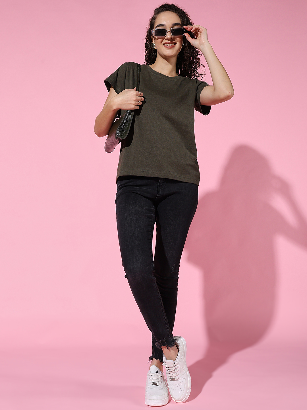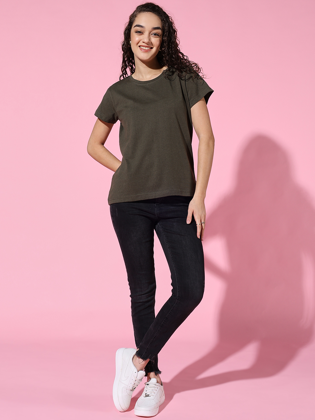 Women's Olive Green Casual T-Shirt - Relaxed Fit Round Neck Tee