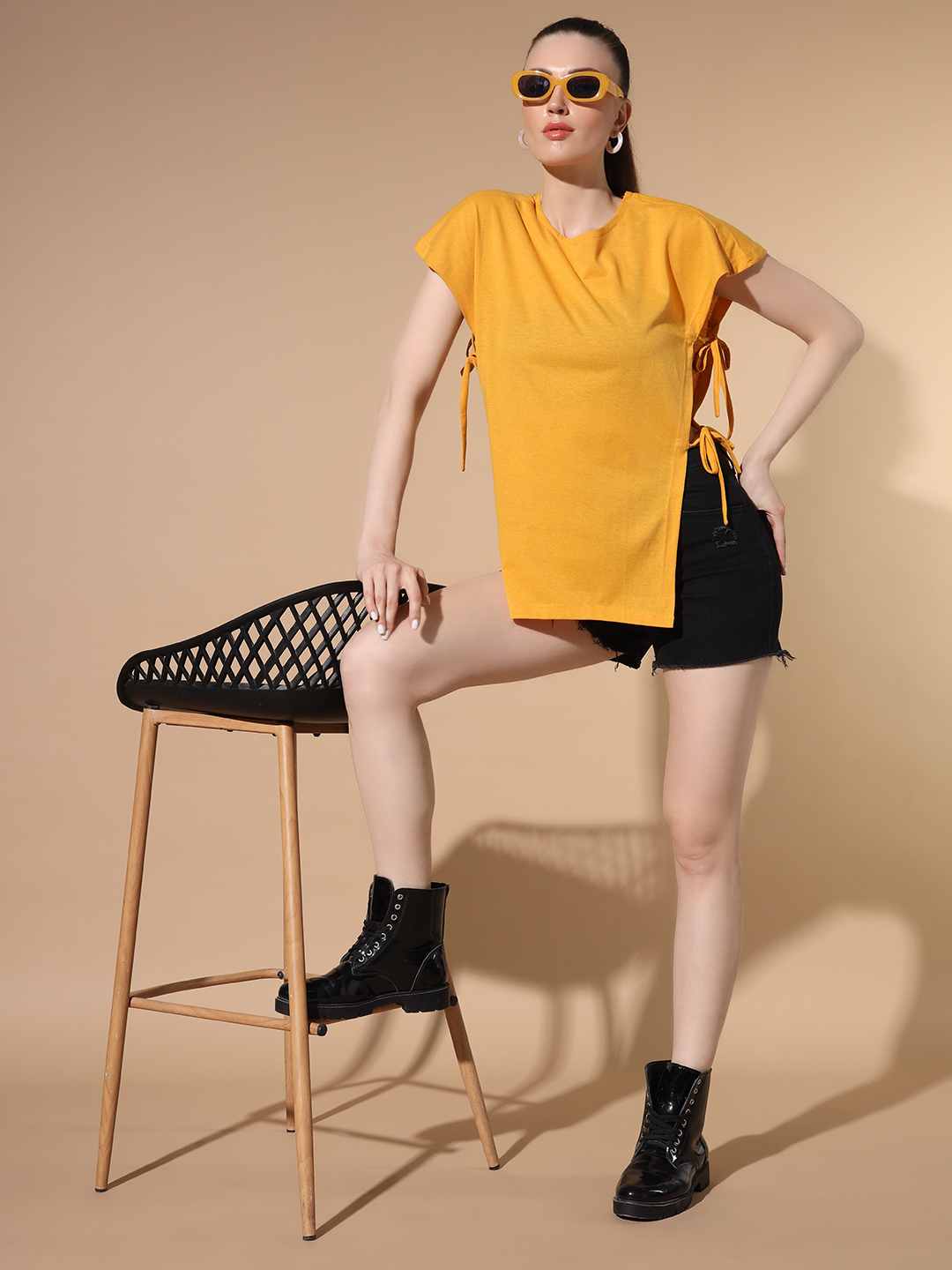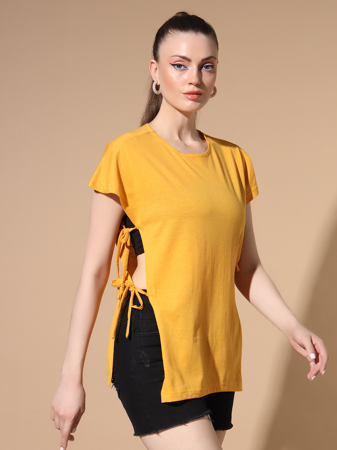 Brighten your style with this stunning Yellow Side Tie Cut-Out Top from Sthulas. Designed to turn heads, this top features stylish side openings with adjustable tie-ups that create a modern, edgy, and super-trendy look.