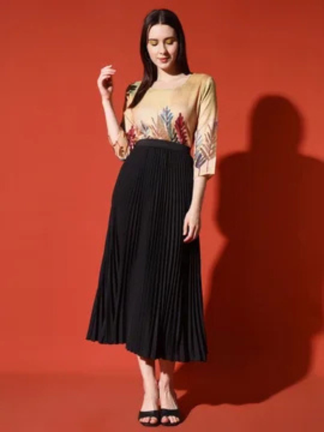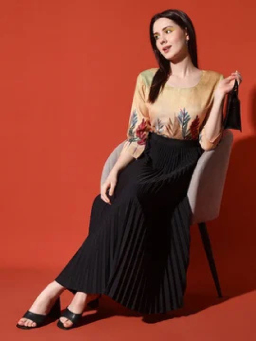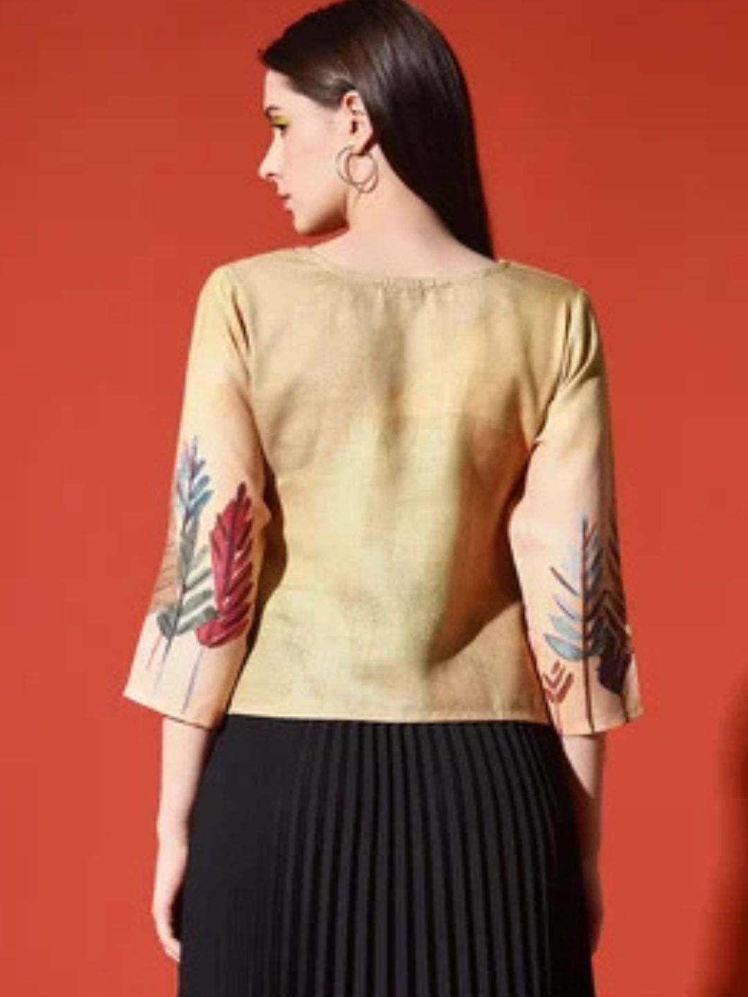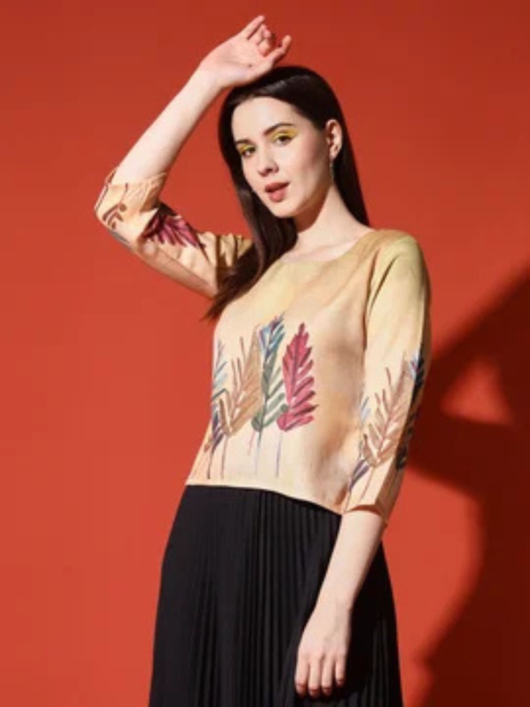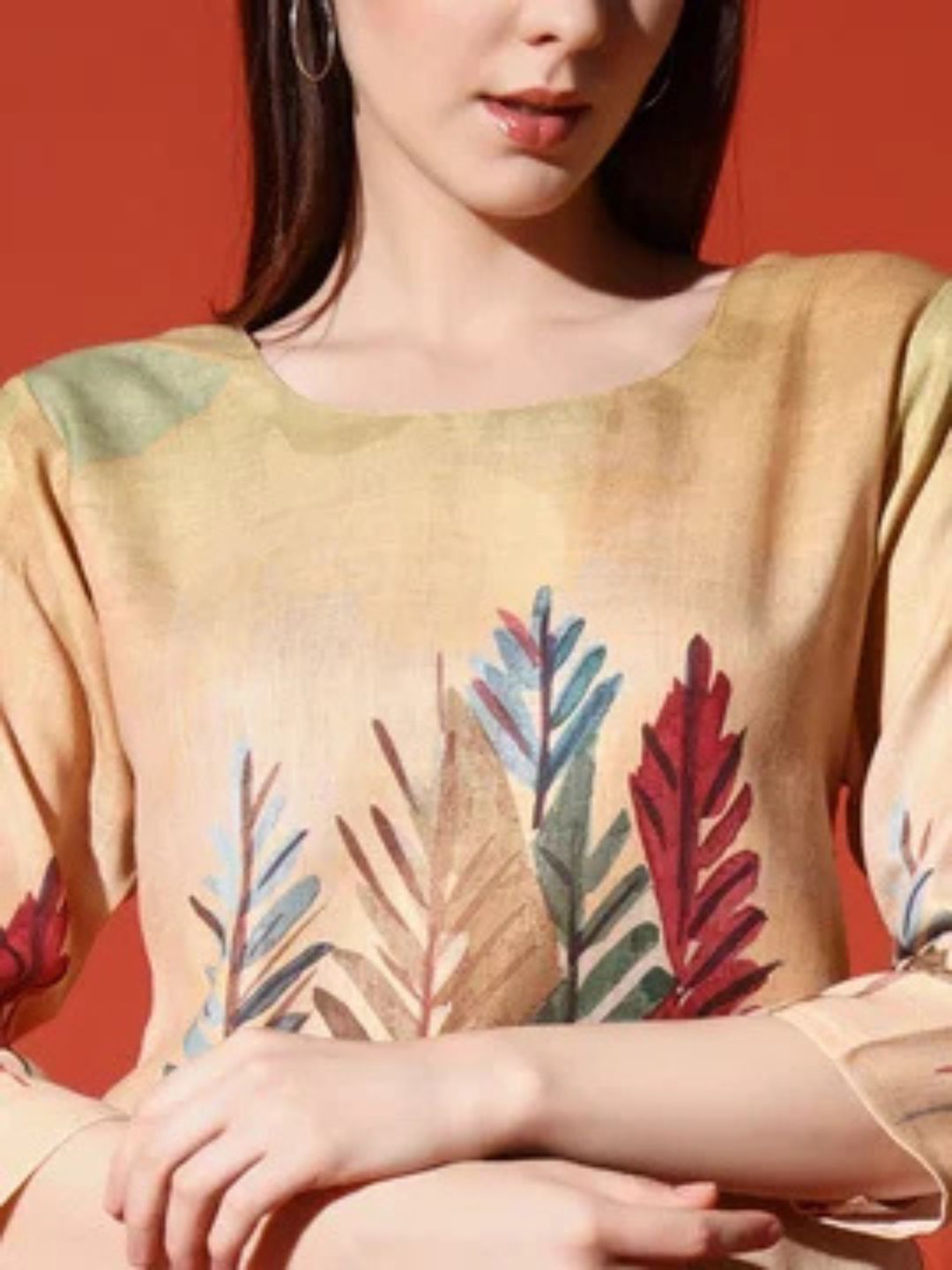 The top is adorned with a beautiful leaf print, showcasing intricate detailing and a delicate, nature-inspired design that brings a touch of elegance and sophistication. The print’s rich green and earthy tones contrast beautifully against the yellow background, creating a harmonious and fresh look that is both modern and timeless.