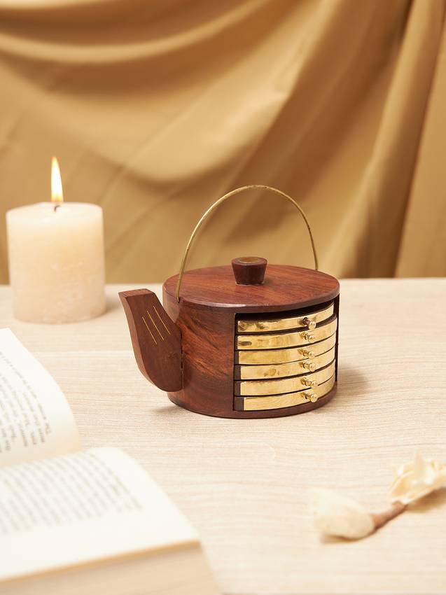 Handcrafted Wooden Kettle-Shaped Storage Box with Brass Inlay | Decorative Tea Pot Design Organizer by Sthulas