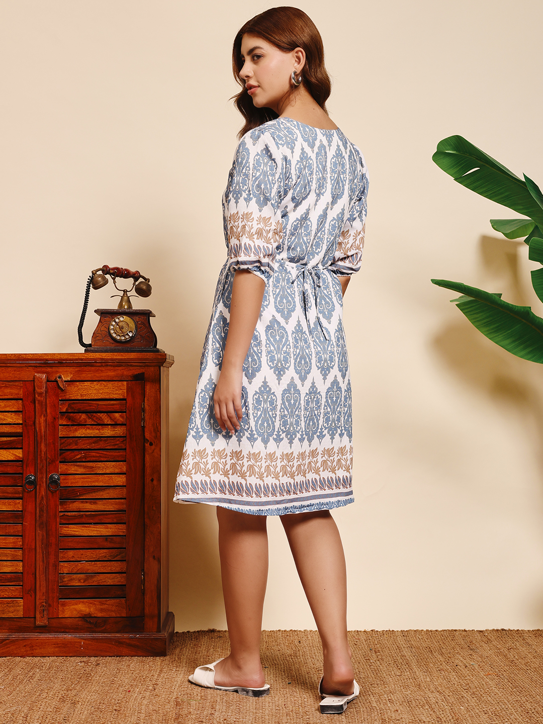 Sthulas Blue & Beige Block Print Cotton Fit and Flare Dress | Casual Summer Wear