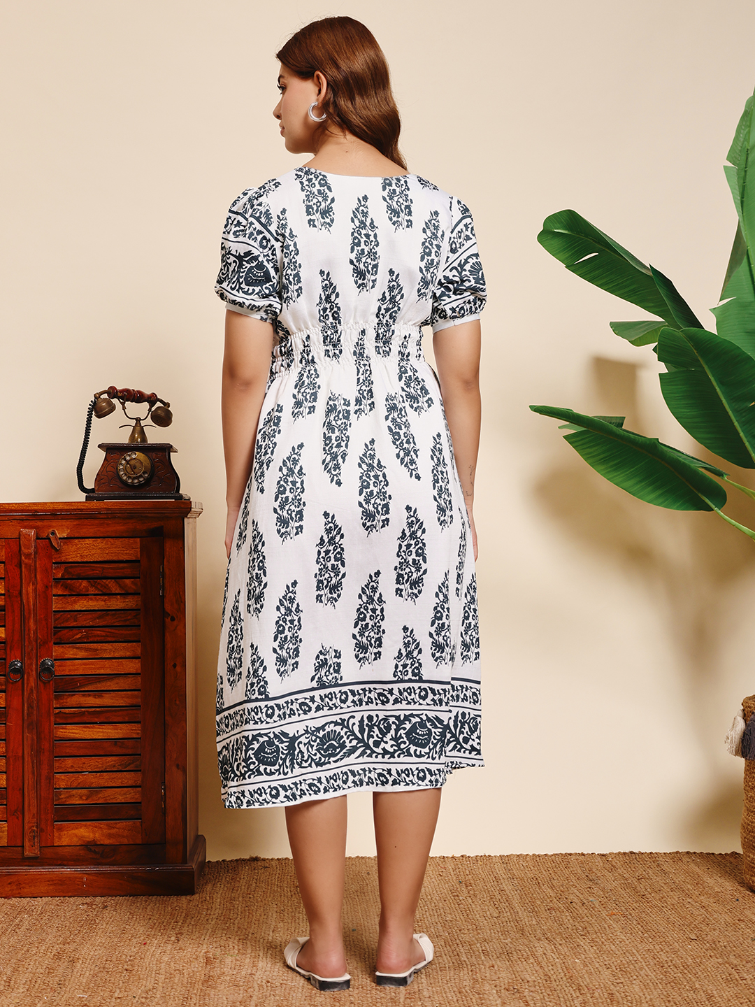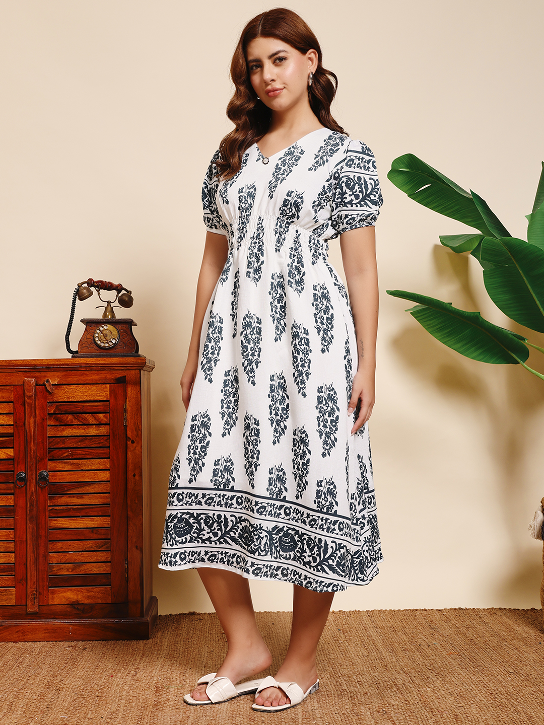 Sthulas White & Navy Blue Block Print Cotton Midi Dress | Elegant Puff Sleeve Fit & Flare Dress