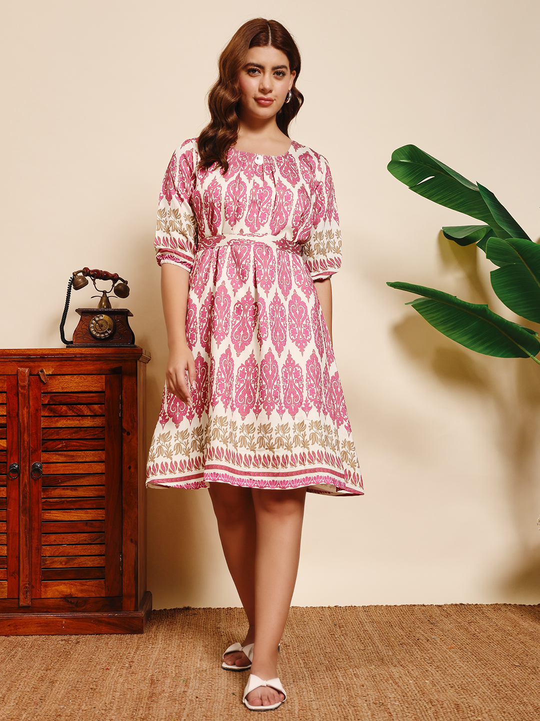 Sthulas Pink & Beige Block Print Cotton Short Dress | Belted Fit & Flare Summer Dress