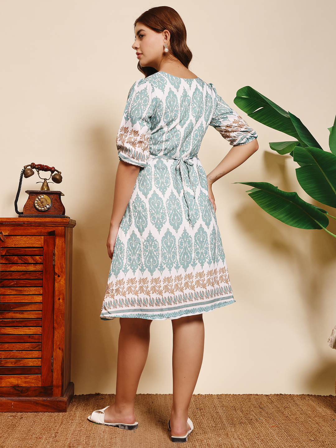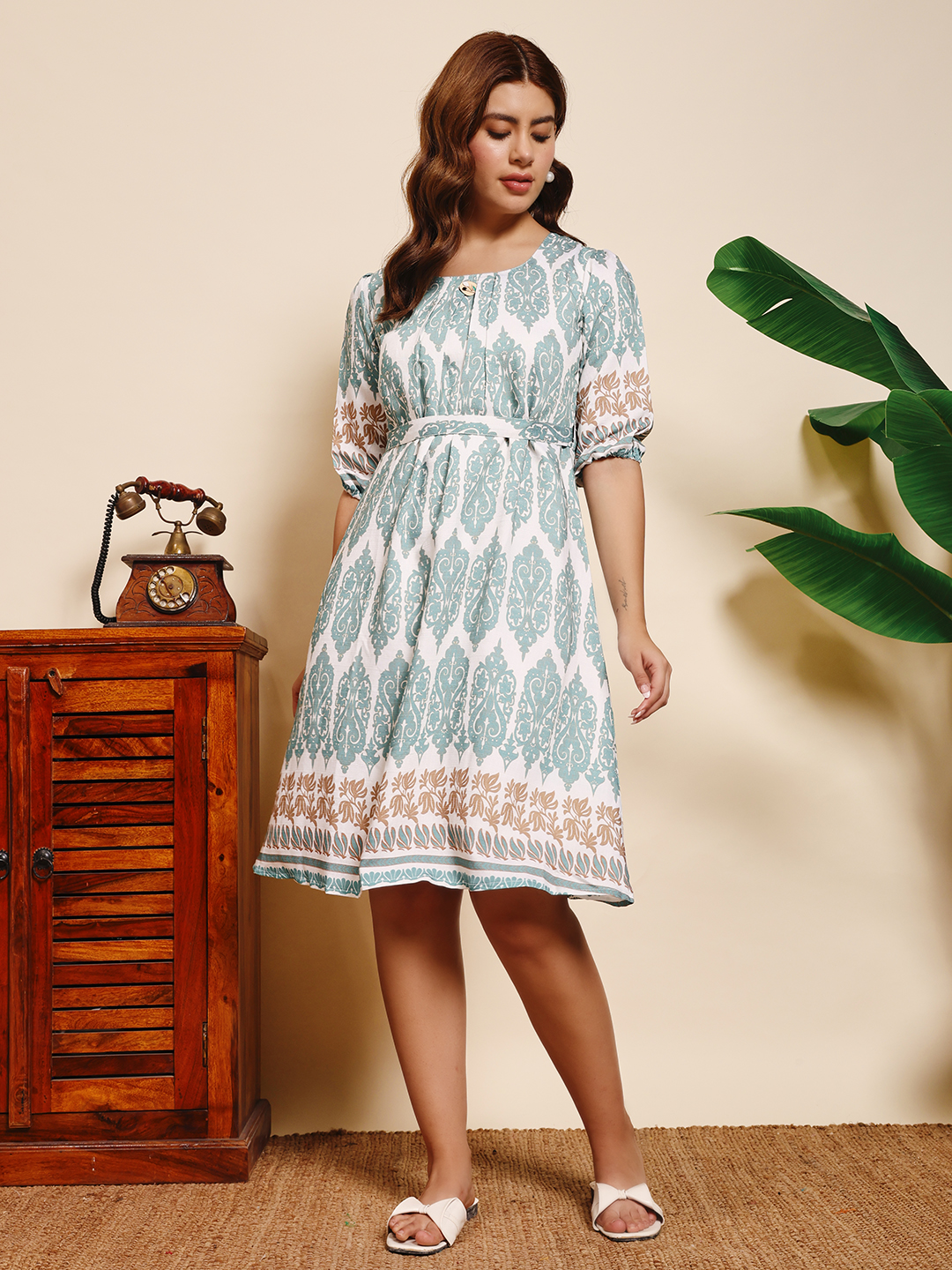 Sthulas Mint Green Printed Cotton Fit & Flare Dress | Round Neck Short Dress