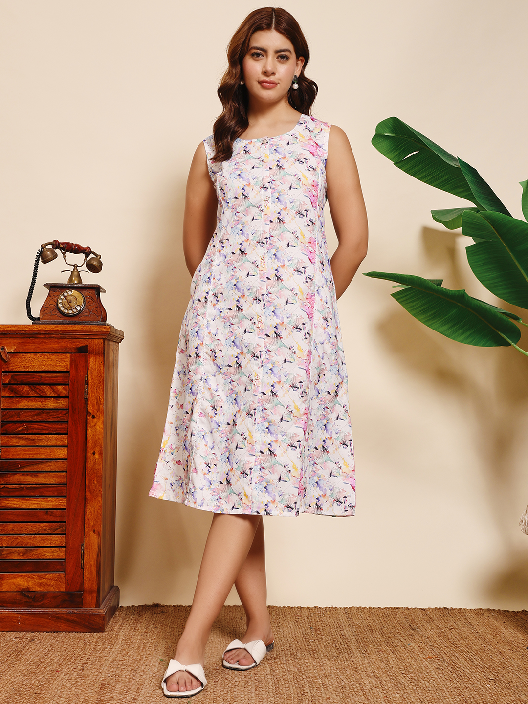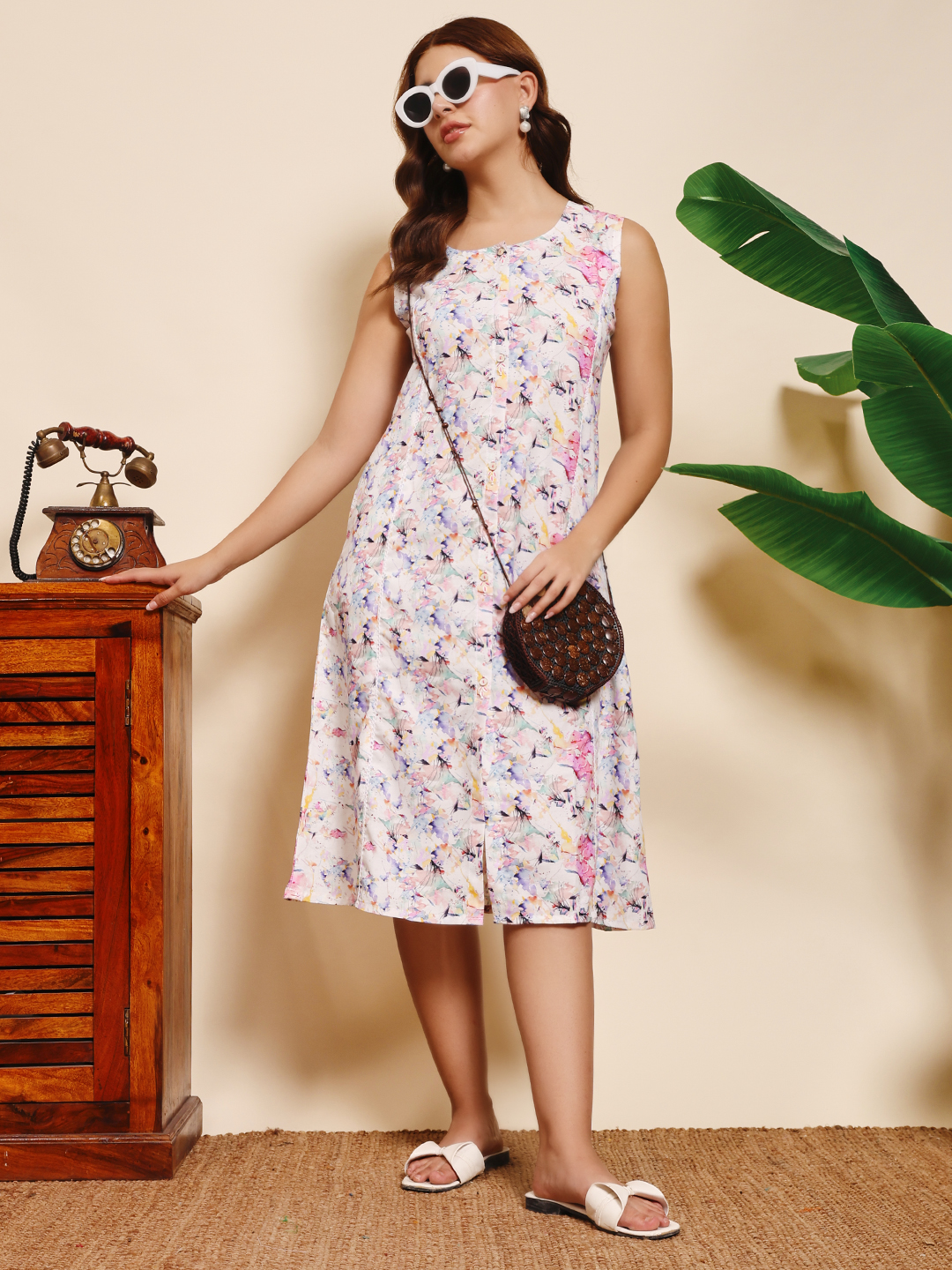 Sthulas Pastel Floral Printed Sleeveless Cotton Dress | Summer Casual Midi Dress