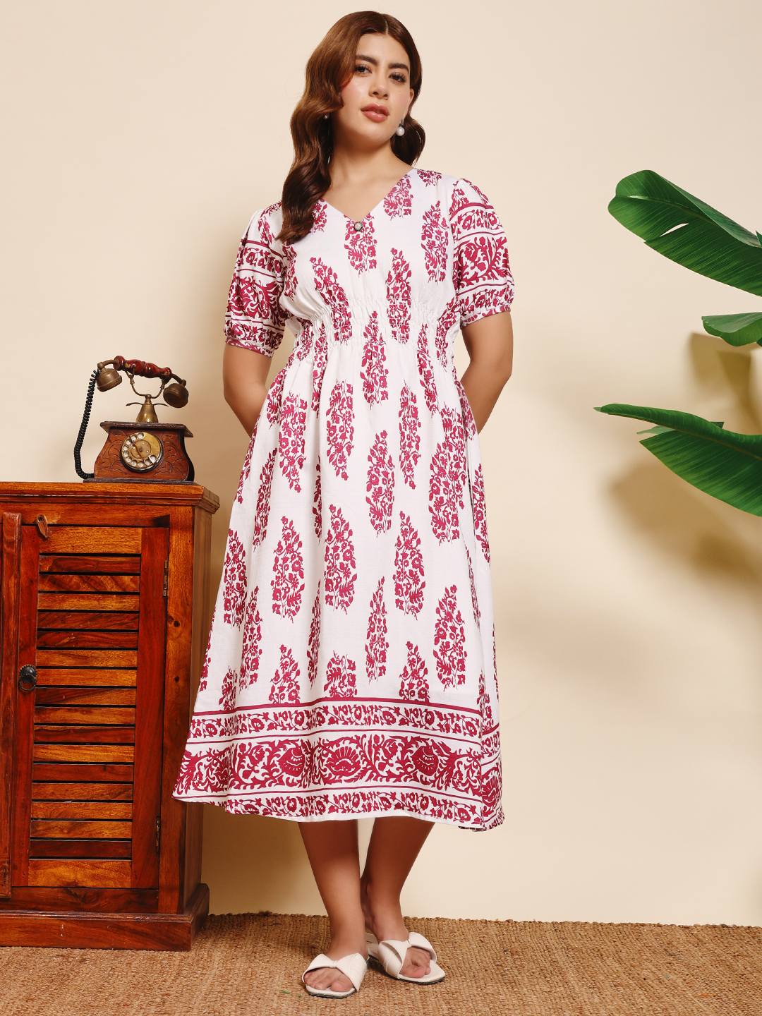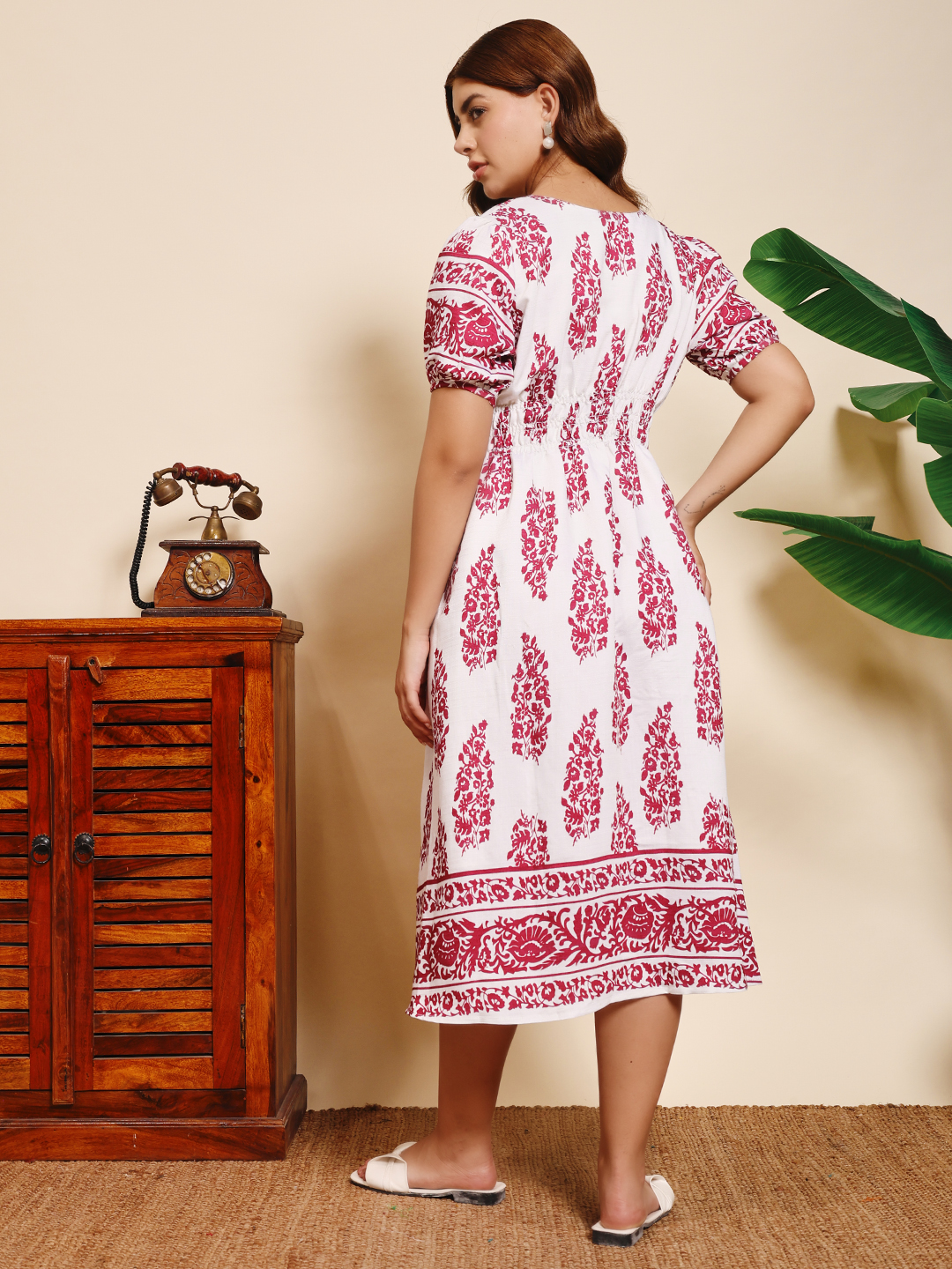 Sthulas White & Red Handblock Printed Cotton Midi Dress | Ethnic Summer Casual Dress for Women
